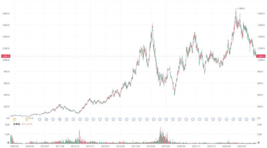 ZOZOは、2010年代半ばから大きく乱高下しながら着実に成長しています。長期的に変動する銘柄なので、買い時は難しいですが、買い増しのチャンスは何度も訪れる銘柄でもあります。