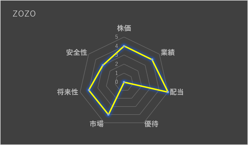 ZOZOの業績は、2018年度に野心的なPB戦略を行い減益となったが、ヤフーグループ傘下に入って以降は、コスト構造の見直しとシナジーの追求により成長軌道へと戻りました。大きな成長はないですが、安定という面を評価して、業績に対する評価は星4つとします。